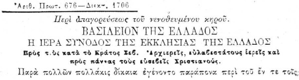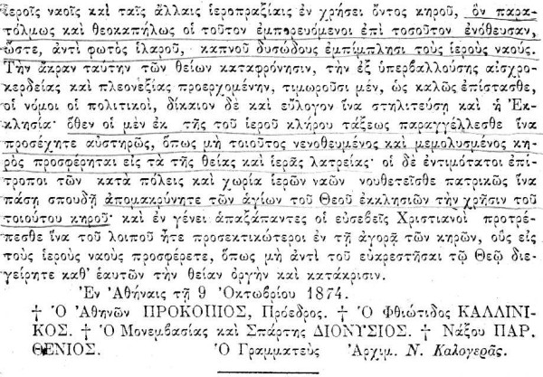Ἀπὸ τὸ βιβλίον «Συλλογὴ τῶν Ἐγκυκλίων τῆς Ἱερᾶς Συνόδου τῆς Ἐκκλησίας τῆς Ἑλλάδος - ἀπὸ τοῦ 1833 μέχρι σήμερον - ἐκδιδομένη ἐντολῇ τῆς Ἱερᾶς Συνόδου», ὑπὸ ἀρχιμανδρίτου Στεφάνου Γιαννοπούλου, Ἐν Ἀθῆναις 1901, σ. 617.