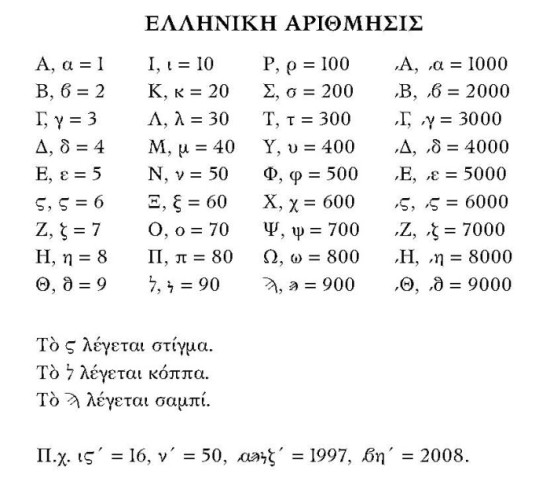 Ἡ ἑλληνική ἀρίθμηση (ἡ φωτογραφία ἀπὸ τὸ βιβλίο «Τυπικὸν Ὄρθρου Ἐνοριῶν»)