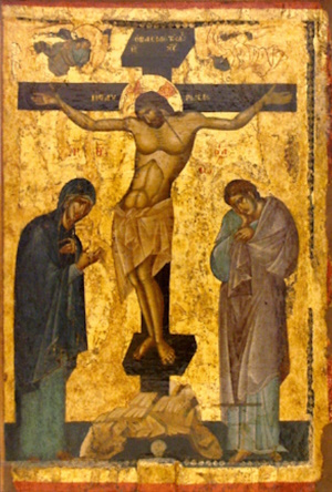 Νά ἀναλύσουμε σήμερα τήν εἰκόνα τῆς σταυρώσεως τοῦ Χριστοῦ. Συνήθως ἔτσι ἀναπαριστάνουμε τήν εἰκόνα τῆς σταυρώσεως τοῦ Χριστοῦ. Ὁ Χριστός ἐσταυρωμένος πάνω στόν Σταυρό, μαζί ἔχουμε τόν χορό τῆς Παναγίας καί τῶν γυναικῶν καί ταυτόχρονα ἀπό κάτω τόν Ἰωάννη τόν θεολόγο καί πίσω ἔχουμε τόν ἑκατόνταρχο. Ὑπάρχει σέ μιά προγενέστερη περίοδο μιά πιό λιτή εἰκόνα, ὅπου εἶναι μόνο ὁ Χριστός ἐσταυρωμένος μαζί μέ τήν Παναγία καί τόν Ἰωάννη τόν Θεολόγο ἀπό κάτω. Καί μιά πιό λιγότερο λιτή πού ἔχει ρεαλιστικά πρόσωπα, ὅπως ὁ χορός τῶν γυναικῶν καί ὁ ἑκατόνταρχος ὁ Λογγῖνος. Μεταγενέστερες εἰκόνες ἀπό αὐτήν, εἶναι πολύ πεφορτισμένες μέ πάρα πολλά ἄλλα πρόσωπα, δηλαδή, κακοῦργοι, ληστές, διῶκτες, ἡ σκάλα, ὁ πετεινός, ὁ ὁποῖος ἐλάλησε τρίς. Εἶναι πολύ φορτωμένες προσεγγίσεις, οἱ ὁποῖες ξεφεύγουν ἀπό τό ἦθος τῆς ὀρθόδοξης λιτότητας καί ἁπλότητας. Ἐμᾶς μᾶς ἐνδιαφέρει νά δώσουμε τά κεντρικά σημεῖα τῆς θεολογίας, καί ὄχι νά φορτώσουμε τήν εἰκόνα μέ πάρα πολύ πλῆθος, πού σίγουρα ὑπῆρχε τήν ὥρα τῆς σταυρώσεως γύρω ἀπό τό Χριστό. Δέν κάνουμε ἕναν ἁγιογραφικό ρεαλισμό, κάνουμε θεολογική λιτή προσέγγιση ὅπως τό θέλει ἡ Ὀρθοδοξία μας. Θά ἔλεγα αὐτό εἶναι ἕνα ὅριο αὐτῆς τῆς εἰκόνας, ἐξ ἀπόψεως φορτώσεως ὑπαρκτοῦ ἀριθμοῦ προσώπων.