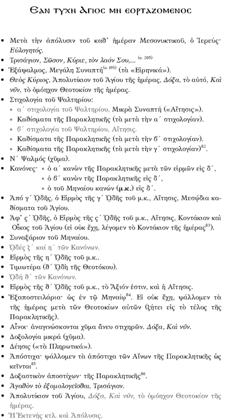 μόνο ἐὰν ἀνεγνώσθῃ ἡ μικρὰ δοξολογία: ἀπόστιχα καὶ δοξαστικὸν τοῦ ἁγίου· ἐὰν δὲν ἔχῃ: τῆς Παρακλητικῆς καὶ ἀγαθὸν τὸ ἐξομολογεῖσθαι, τρισάγιον, ἀπολυτίκιον, ἡ ἐκτενής, καὶ ἡ ἀπόλυσις ἐὰν ἐψάλῃ ἡ Μεγάλη Δοξολογία: ἀπολυτίκιον, ἡ ἐκτενής, ἡ δέησις («τὰ Πληρωτικά»), καὶ Ἀπόλυσις |