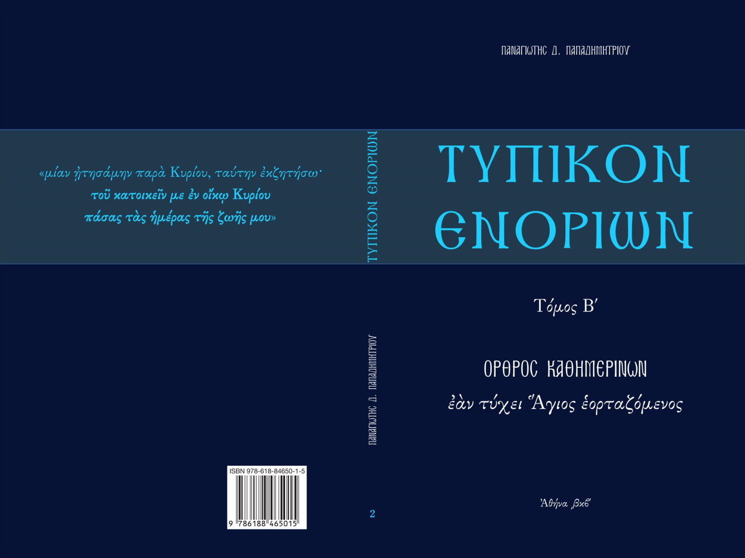 Κυκλοφόρησε (12 Ὀκτ. 2022) ἡ νέα ἔκδοση τοῦ Βʹ Τόμου τῆς σειρᾶς «ΤΥΠΙΚΟΝ ΕΝΟΡΙΩΝ», μὲ τὸν Ὄρθρο τῶν καθημερινῶν ὅταν τύχει Ἅγιος Ἑορταζόμενος.