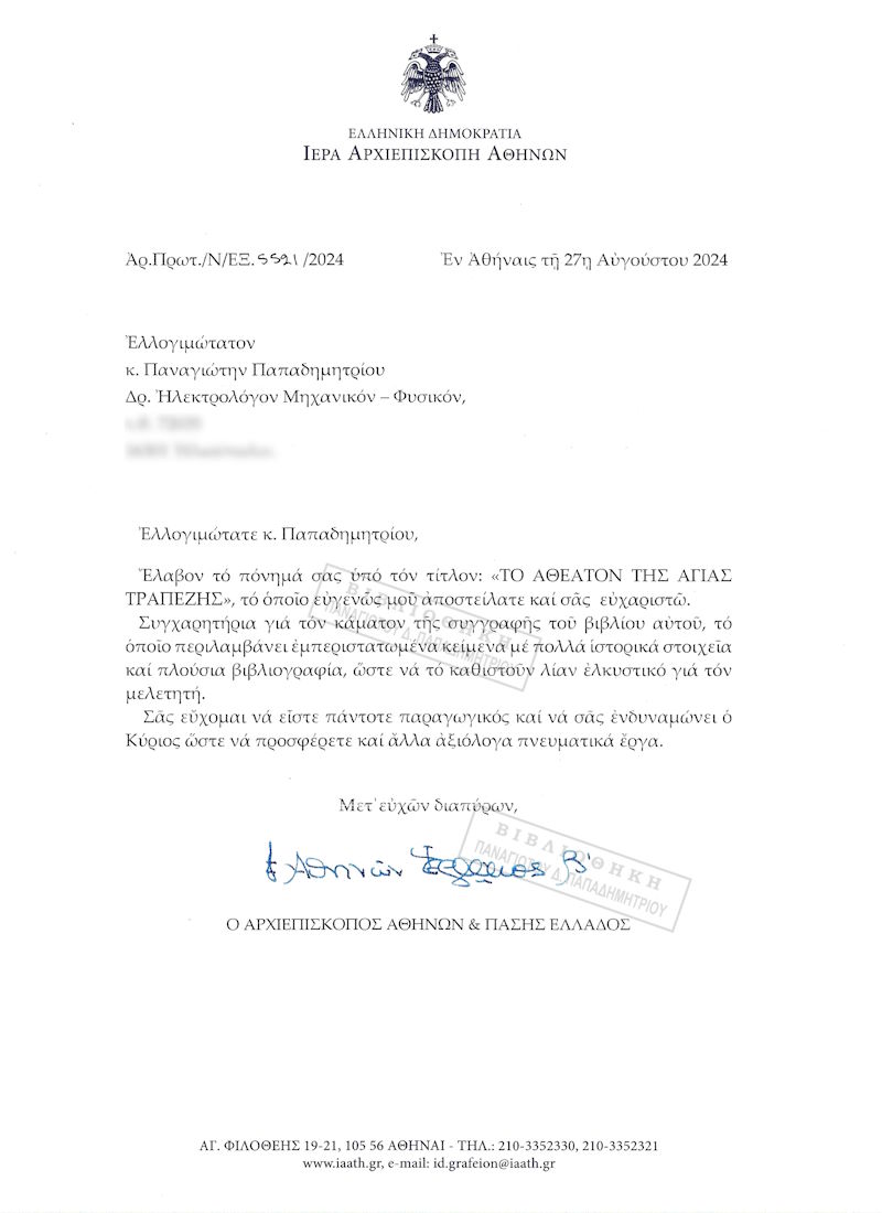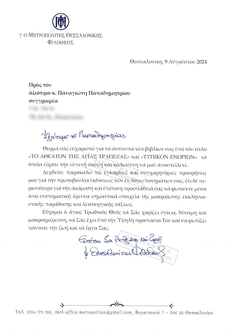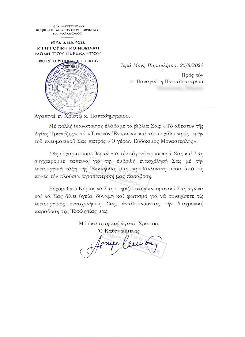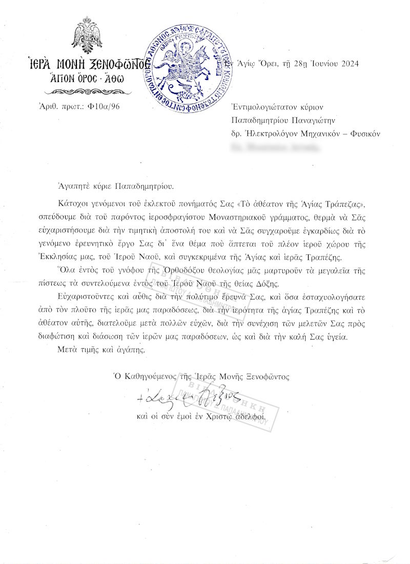 [...]. Κάτοχοι γενόμενοι τοῦ ἐκλεκτοῦ πονήματός Σας «Τὸ ἀθέατον τῆς Ἁγίας Τράπεζας», σπεύδουμε διὰ τοῦ παρόντος ἱεροσφραγίστου Μοναστηριακοῦ γράμματος, θερμὰ νὰ Σᾶς εὐχαριστήσουμε διὰ τὴν τιμητικὴ ἀποστολή του καὶ νὰ Σᾶς συγχαροῦμε ἐγκαρδίως διὰ τὸ γενόμενο ἐρευνητικὸ ἔργο Σας δι' ἕνα θέμα ποὺ ἅπτεται τοῦ πλέον ἱεροῦ χώρου τῆς Ἐκκλησίας μας, τοῦ Ἱεροῦ Ναοῦ, καὶ συγκεκριμένα τῆς Ἁγίας καὶ ἱερᾶς Τραπέζης.